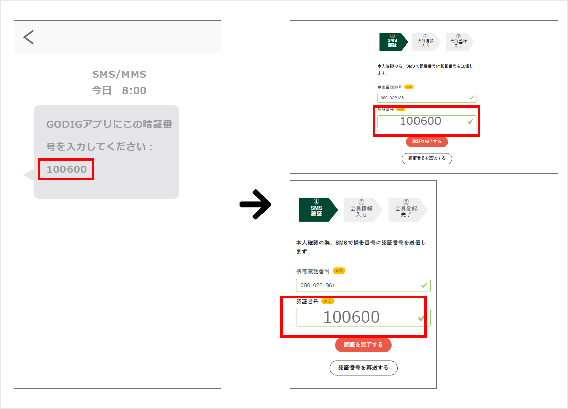 1.会員情報登録の後、入力した電話番号宛にSMSが届きます。