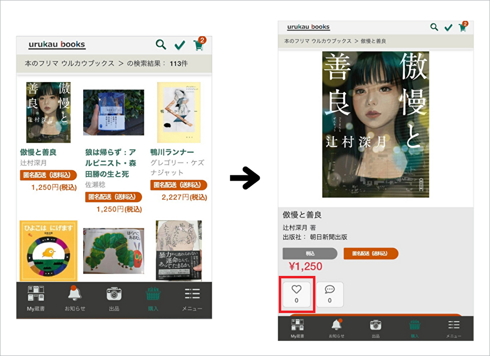 ・いいねを解除したいときは、商品の画像右下に表示されているハートマークをタップするか、商品詳細画面内のハートマークを再度タップすることで、解除することができます。