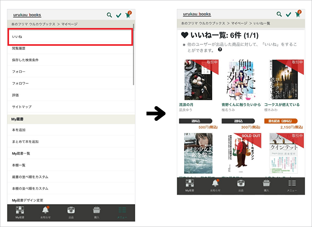 いいねした商品はトップページに表示されるほか、メニューの『いいね』からも閲覧する事ができます。