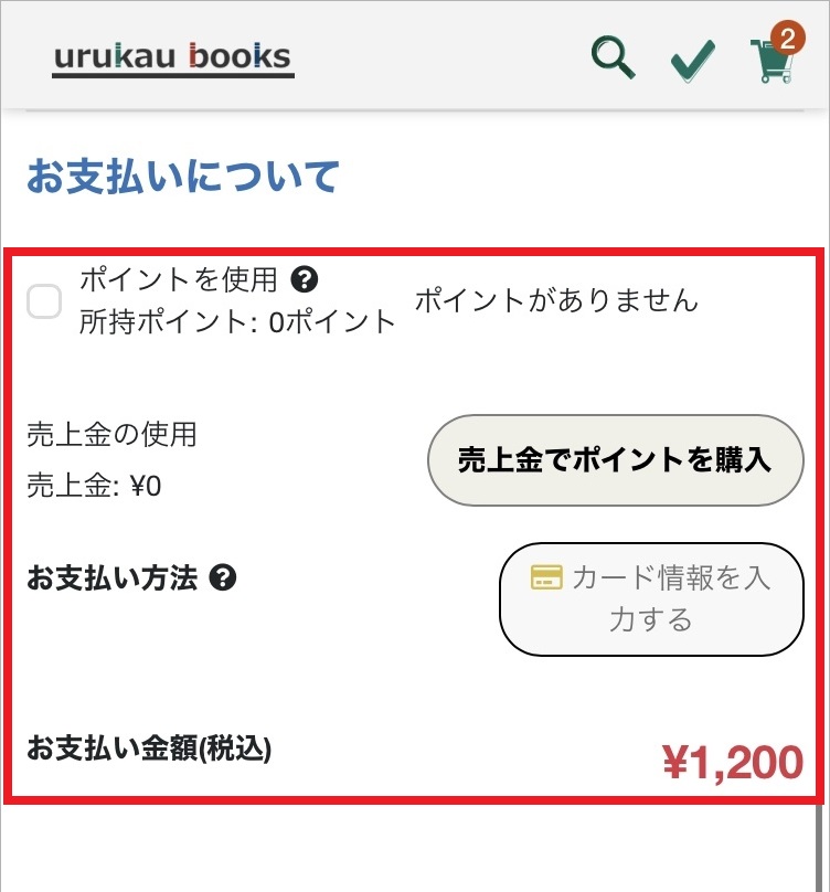 ▲urukauではクレジットカード決済かポイント決済(urukau独自)のいずれかにて決済が可能です。