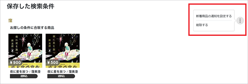 ▲作成日の横にある[︙]をクリックし、[新着商品の通知を設定する]をクリックすると保存した検索条件の編集ができます。