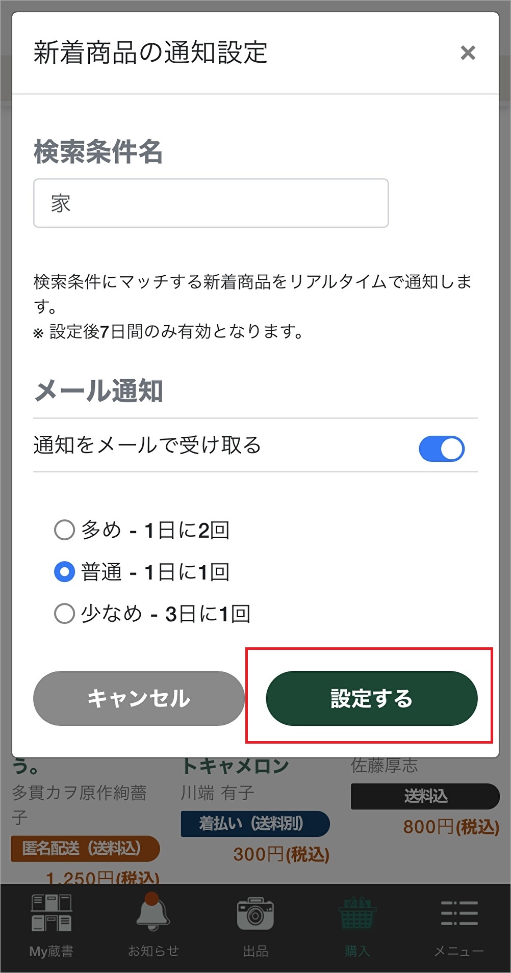 ▲検索条件名をご確認いただき、メール通知の有無、メール通知を受ける場合の頻度(多め – 1日に2回、普通 – 1日に1回、少なめ – 3日に1回)を選択して[設定する]をタップすると検索条件の保存が完了します。