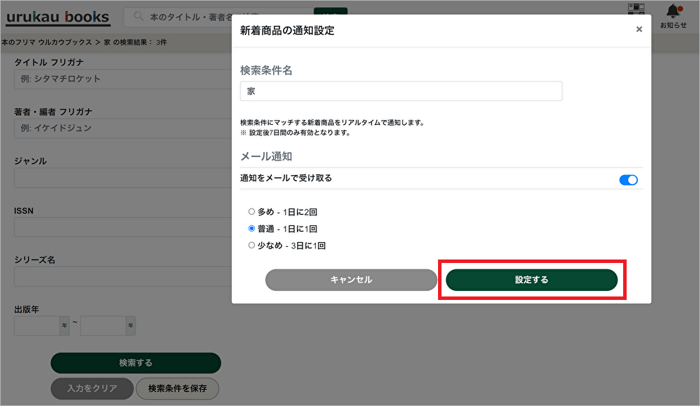 ▲検索条件名をご確認いただき、メール通知の有無、メール通知を受ける場合の頻度(多め – 1日に2回、普通 – 1日に1回、少なめ – 3日に1回)を選択して[設定する]をクリックすると検索条件の保存が完了します。