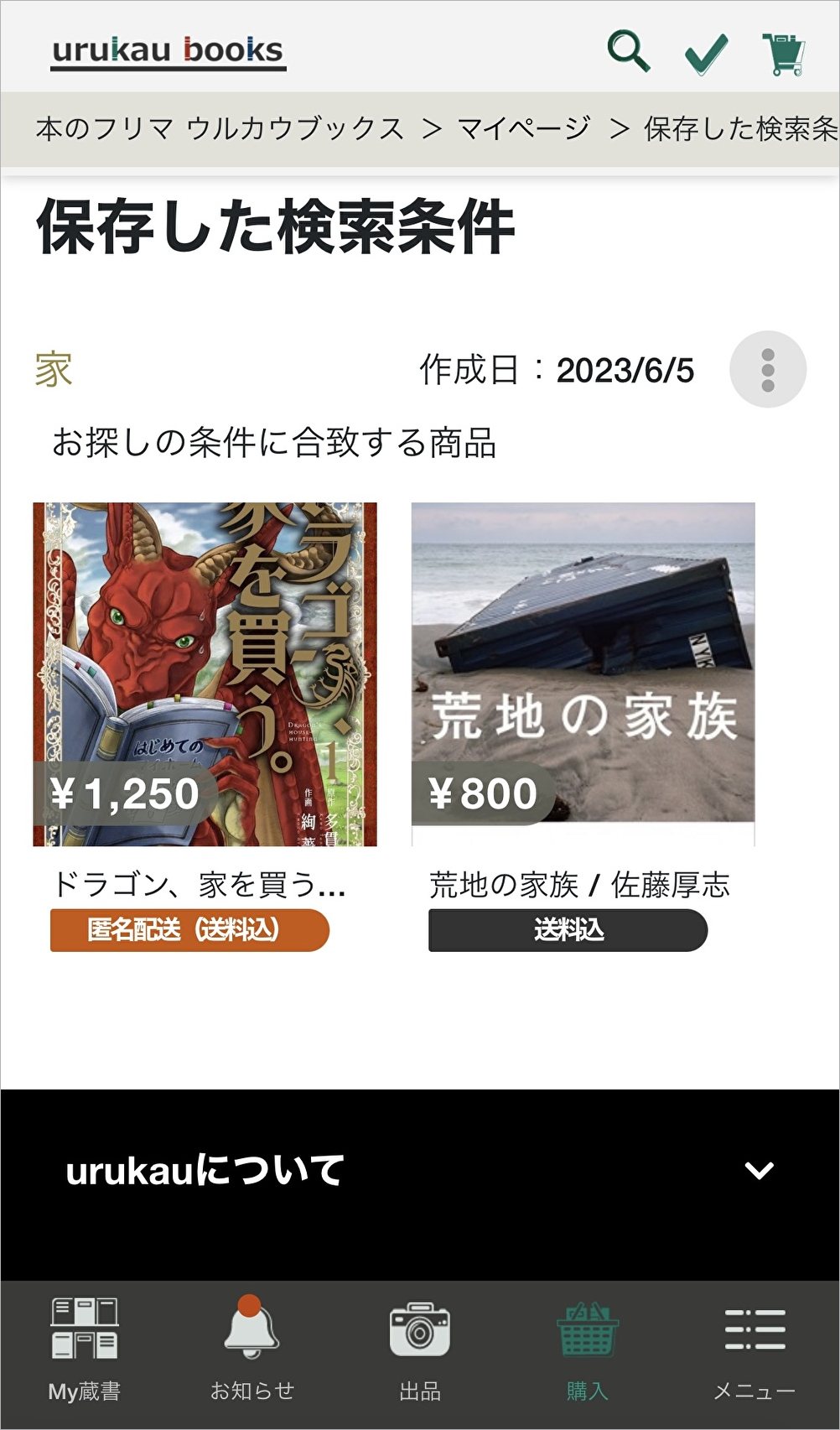 ▲検索条件名、お探しの条件に合致する商品、検索結果を保存した日付が表示されます。