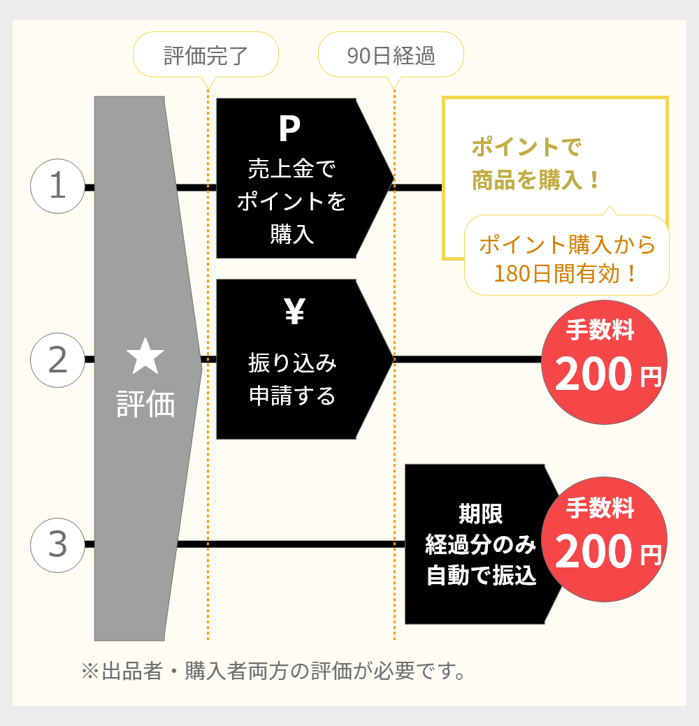 原則、双方評価していただいて取引完了になり、出品者には、出品した時の販売価格から必要経費を引かれた販売利益が売上金として反映されます。