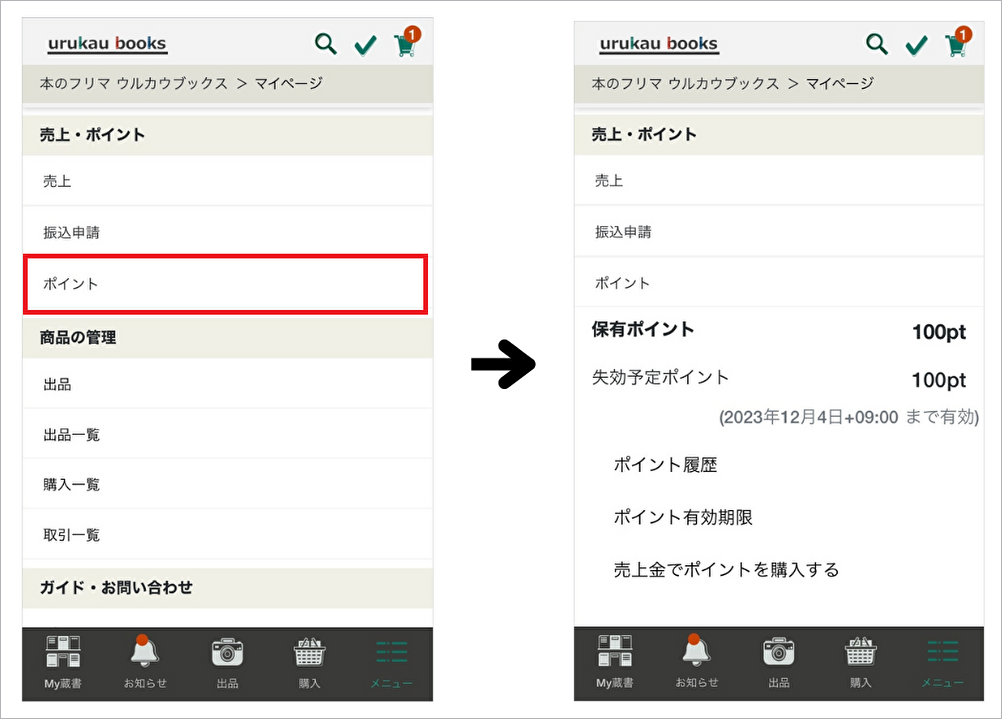 urukauでは、1ポイント=1円として、サービス内で商品を購入する際に利用できます。 商品を販売した際の売上金でポイントを購入することができます。 ※売上金で直接商品を購入することはできません。