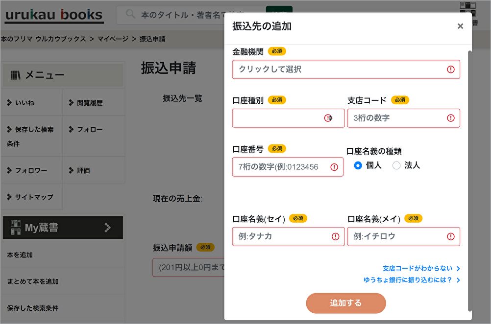 振込申請は、現在の売上金残高が201円以上であれば可能です。