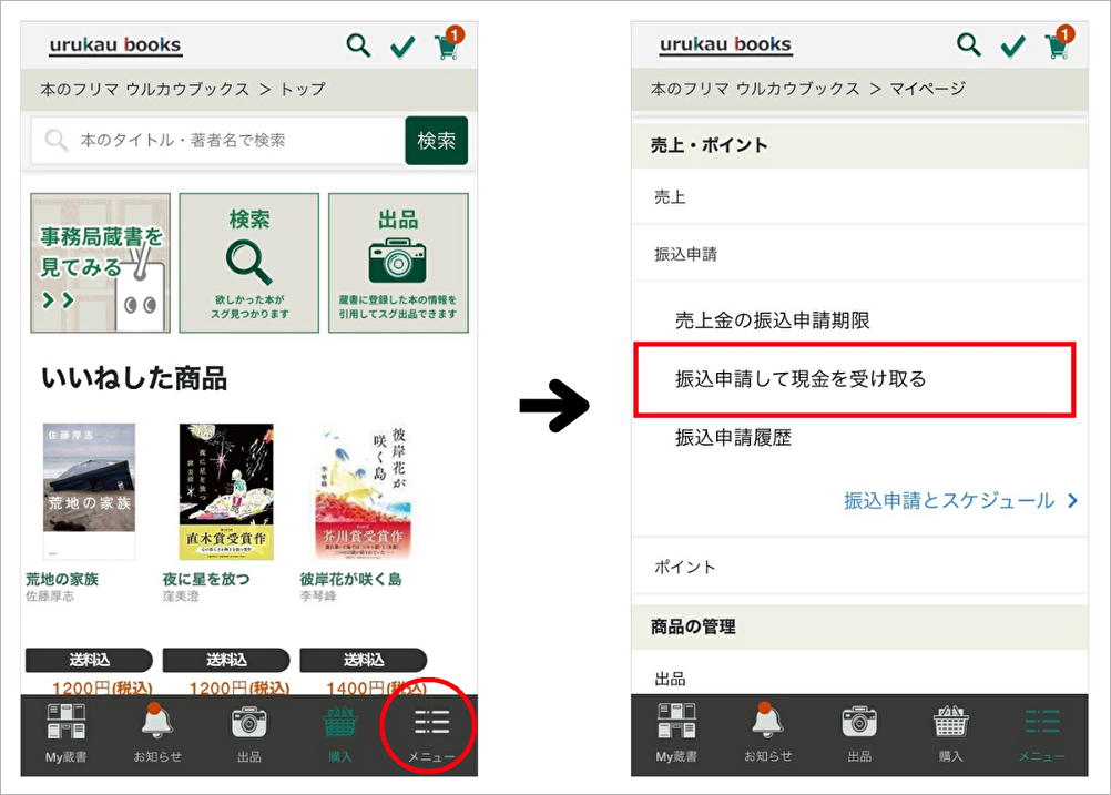 1.メニューから[振込申請]をタップ又はクリックしてください。