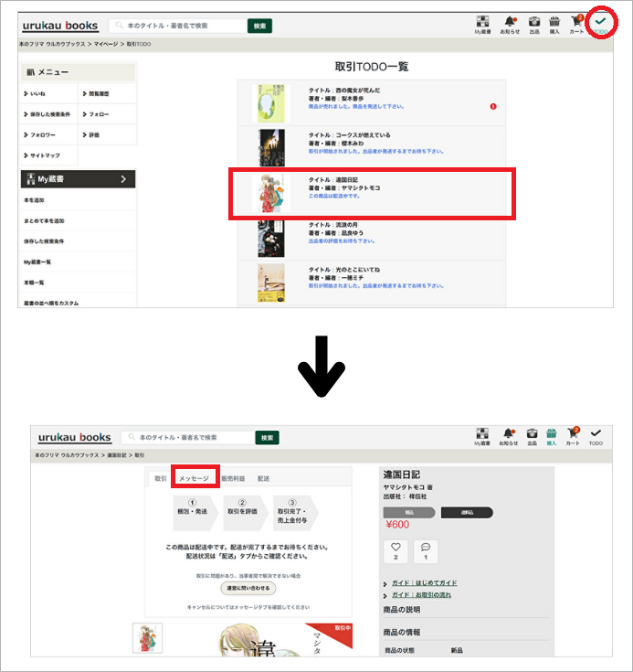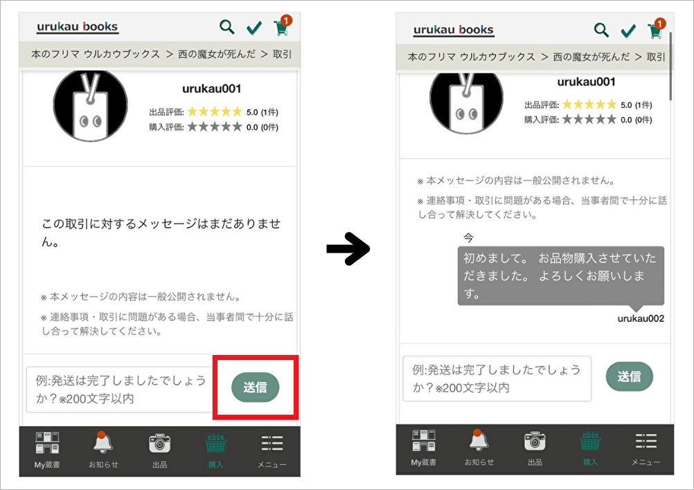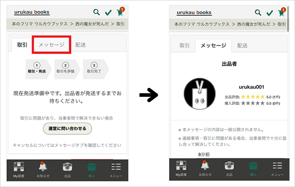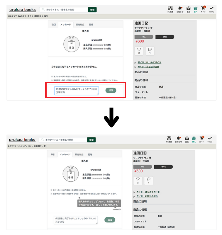 取引メッセージとは、購入手続きをすると、出品者と購入者間でやりとりができる仕組みです。