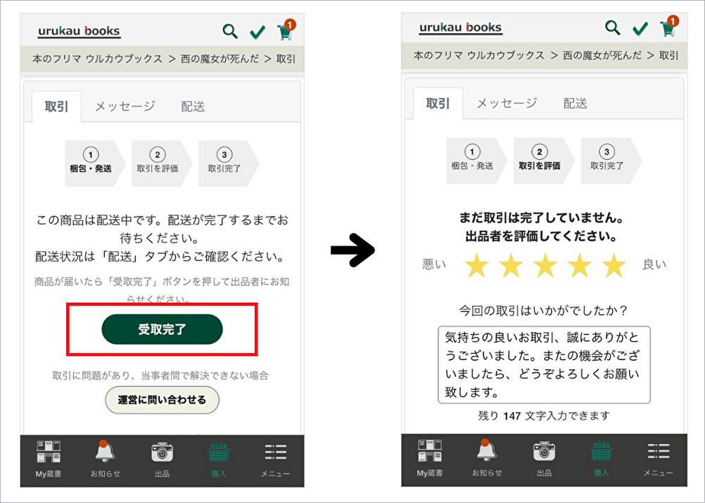 urukauでは、出品者と購入者が評価を投稿することで取引が終了します。